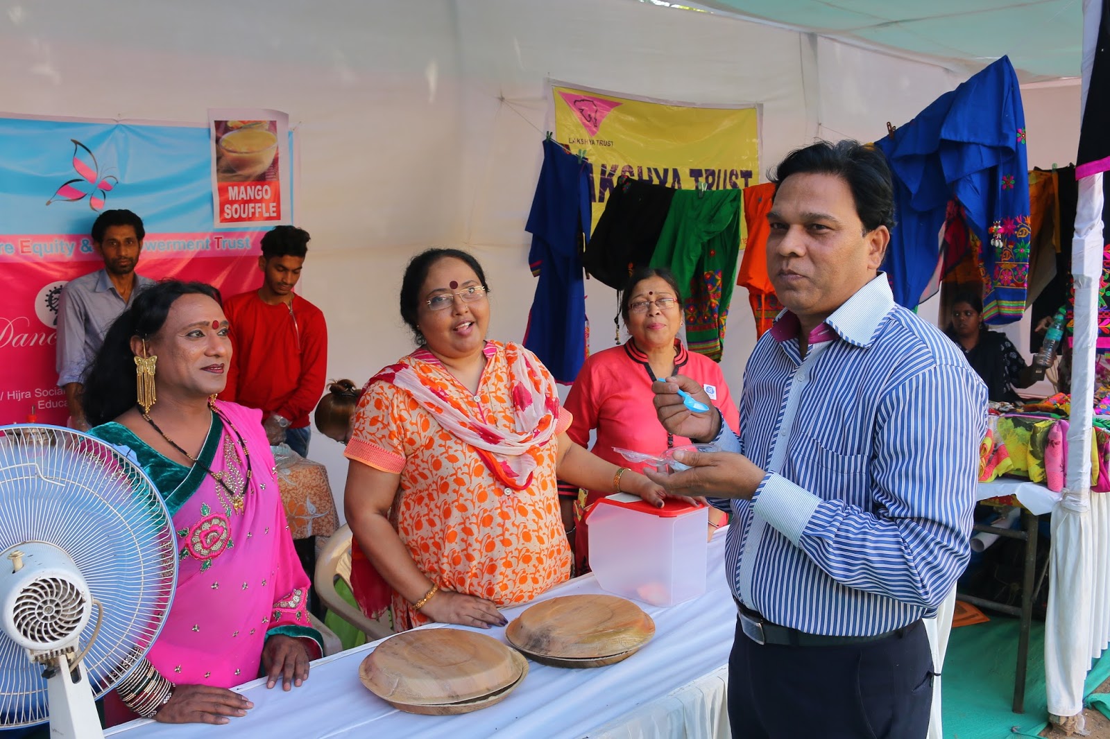 गुजरात – वड़ोदरा से रंग – बिरंगे परिधान ले आईं किन्नर उर्वशी ने कहा, “पहले तो मुझे ज़रा घबराहट थी कि क्या होगा, कौन लोग हैं, शायद किसी प्रकार की जागरूकता का कार्यक्रम होगा, लेकिन यहाँ सभी लोगों से मिलने के बाद साड़ी परेशानी दूर हो गई और साथ ही दोनों ही दिन मुझे लोगों का बहुत ही अच्छा रेस्पोंस (प्रतिसाद) मिला। “बहुत ख़ुशी हुई यहाँ काम कर के। दुःख इस बात का है कि सिर्फ दो दिन ही इस मेले का आयोजन किया गया।” , यह कहना था करीमा का जिन्होंने मेकअप का स्टाल लगा रखा था, लोगों के जोश का अंदाजा उनके स्टॉल के बाहर लगी लाइन को देखकर सहज ही लगाया जा सकता था।